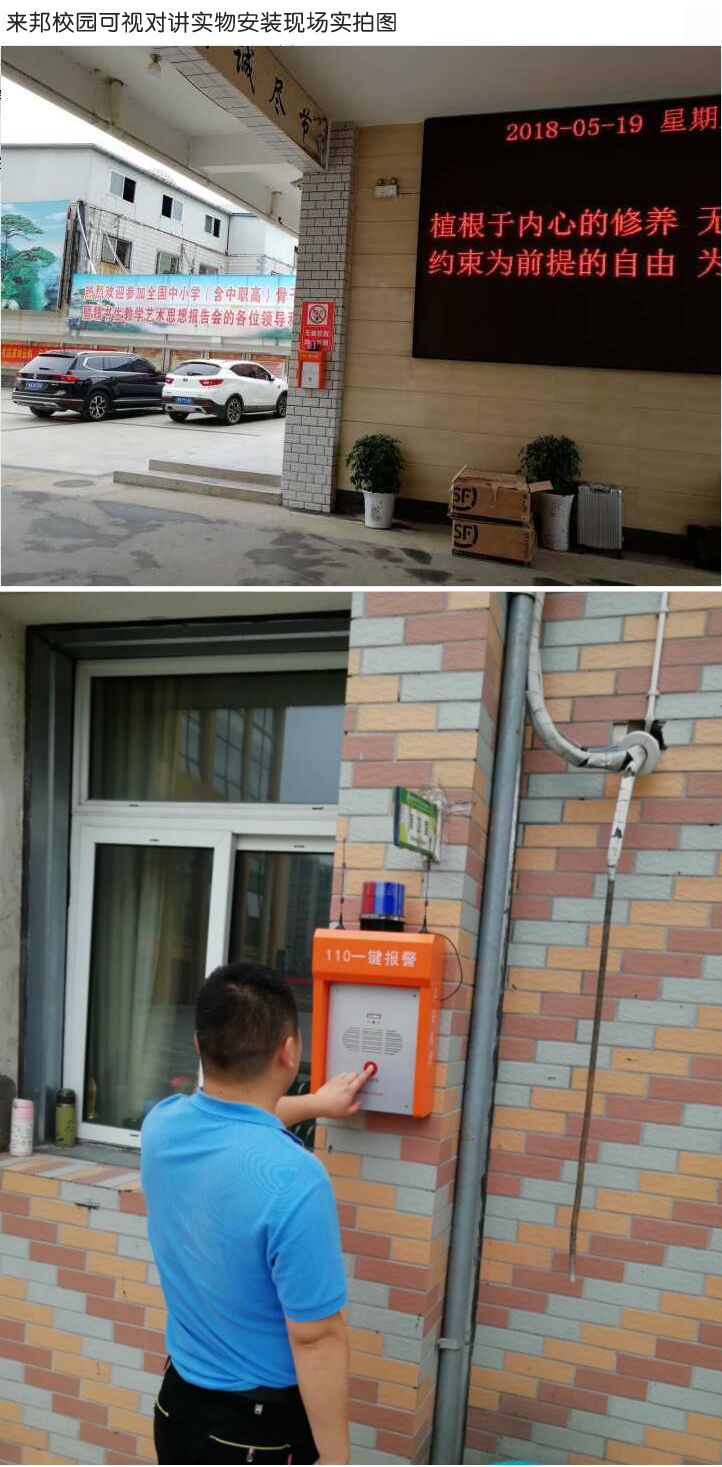 ① 一键报警、可视对讲:在校门口、校内道路、教学楼等区域安装可视对讲报警终端,提供给学生使用,学生在需要帮助或发现打架、斗殴或其他危险警情时,通过可视对讲报警终端设备一键报警到校保卫科的主机或监控中心平台主机,与保卫科实现双向可视对讲,对于需要上报处理的,可逐渐上报。