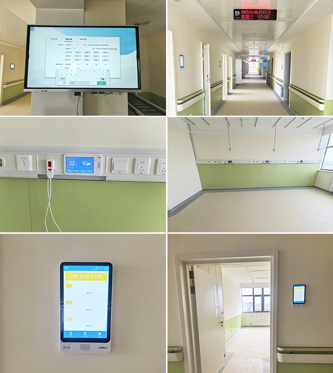 病房门口,具有信息交互显示的门口机可清晰地显示患者的基本诊疗信息、护理等级、责任医生及责任护士。智能走廊屏,可直观显示呼叫患者的病房、床位号,指引护士第一时间前往处理。