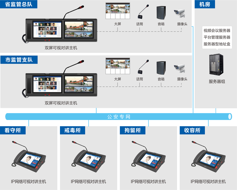 伟德国际唯一官网入口公安监管视频会商系统 基于IP网络架构(可跨网段跨路由),以高清音视频编解码技术为核心,构建一套功能完善、扩展性强、实用性高的联网式音视频实时交互系统。实现省监管总队、市监管支队、监所单位之间可视对讲、视频会议、视频督查等功能。