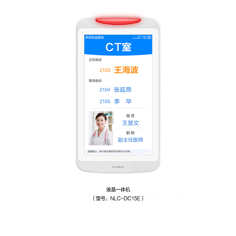 ? 采用15.6英寸液晶显示屏,内置灯带双侧发光设计,壁挂式安装在体检室门口。