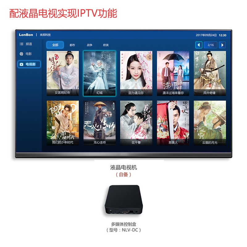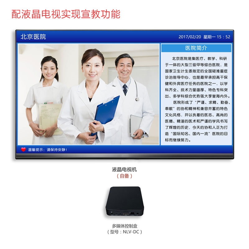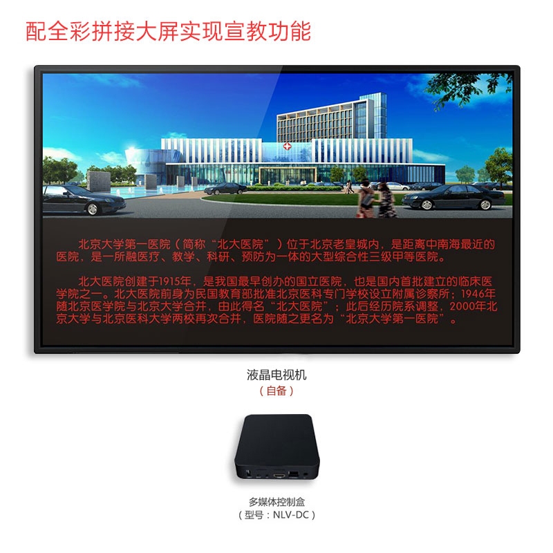 局域网传输,多媒体控制盒(型号:NLV-DC)可通过HDMI线外接液晶显示屏 、电视机、全彩拼接屏(矩阵)等显示设备(显示设备需自备)。